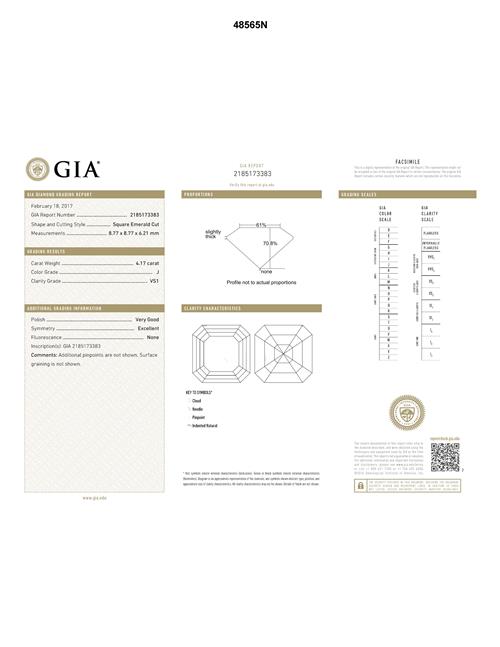 Accompanied by a GIA report numbered 2185173383, dated 18 February 2017 stating that the 4.17 carat diamond is J colour, VS1 clarity, laser inscribed.