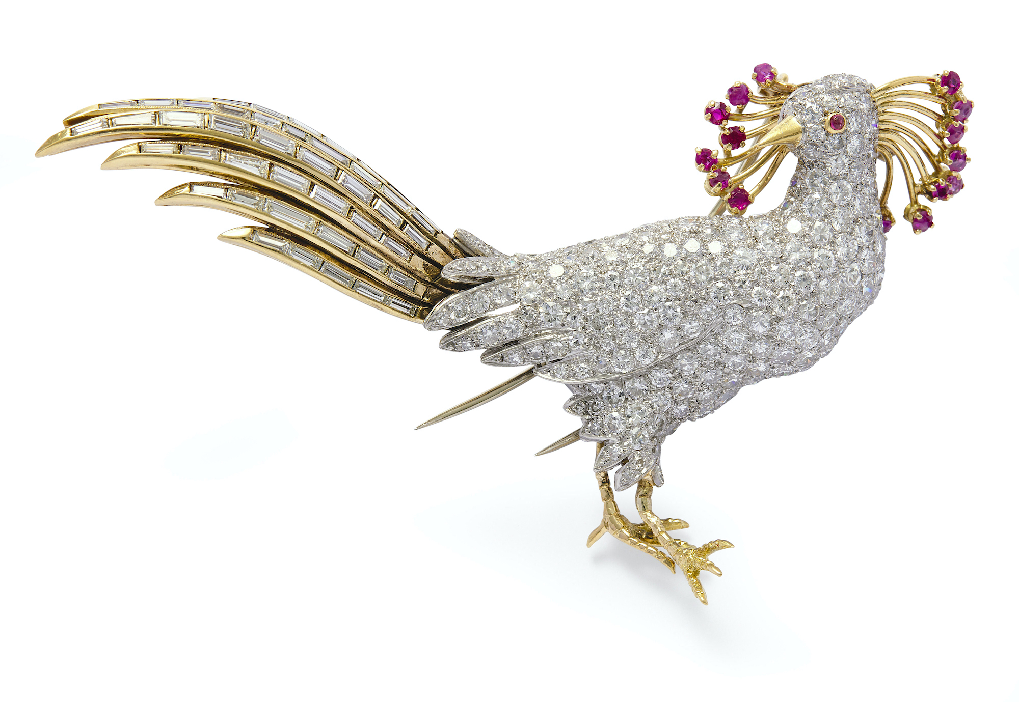 Modelled as a pheasant, the eyes accented with a cabochon ruby, the plume claw-set with circular-cut rubies, the neck, saddle and breast pavé-set with brilliant-cut diamonds, the tail embellished with baguette diamonds, the diamonds together weighing approximately 12.00 carats, length approximately 85mm, one diamond deficient.