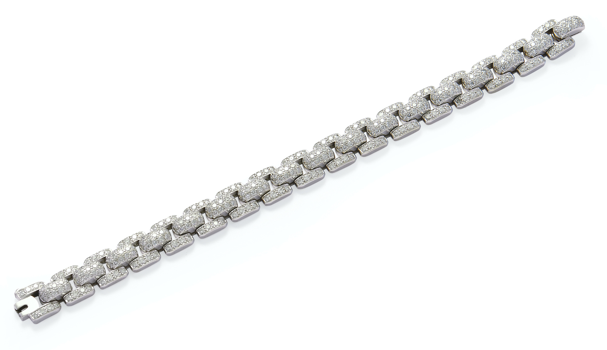 Composed of three rows of brick links pavé-set with brilliant-cut diamonds, the diamonds together weighing approximately 8.00 carats, length approximately 170mm, signed Cartier, numbered 918671.