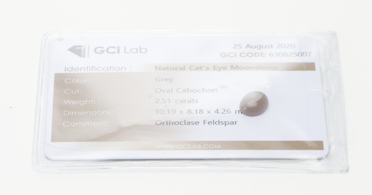 A LOOSE NATURAL CAT'S EYE MOONSTONE CUT EN CABOCHON WEIGHING 2.51CTS, ACCOMPANIED WITH A GCI LAB IDENTIFICATION CARD