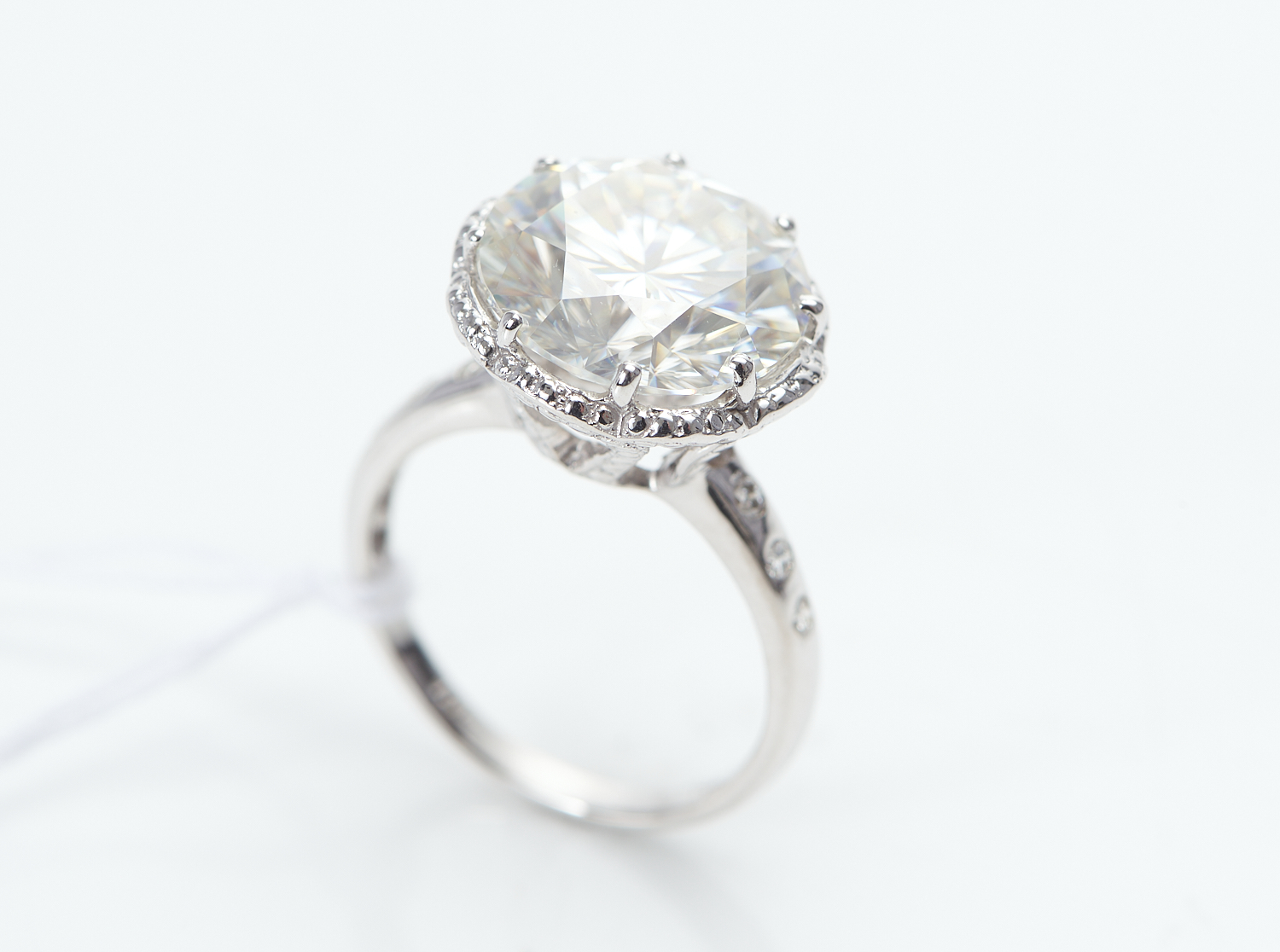 A COLUMBIAN EMERALD AND DIAMOND SET RING IN 18CT WHITE GOLD, THE EMERALD WEIGHING 15.11CTS, THE DIAMONDS WEIGHING 1.01CTS, TOTAL WEI...
