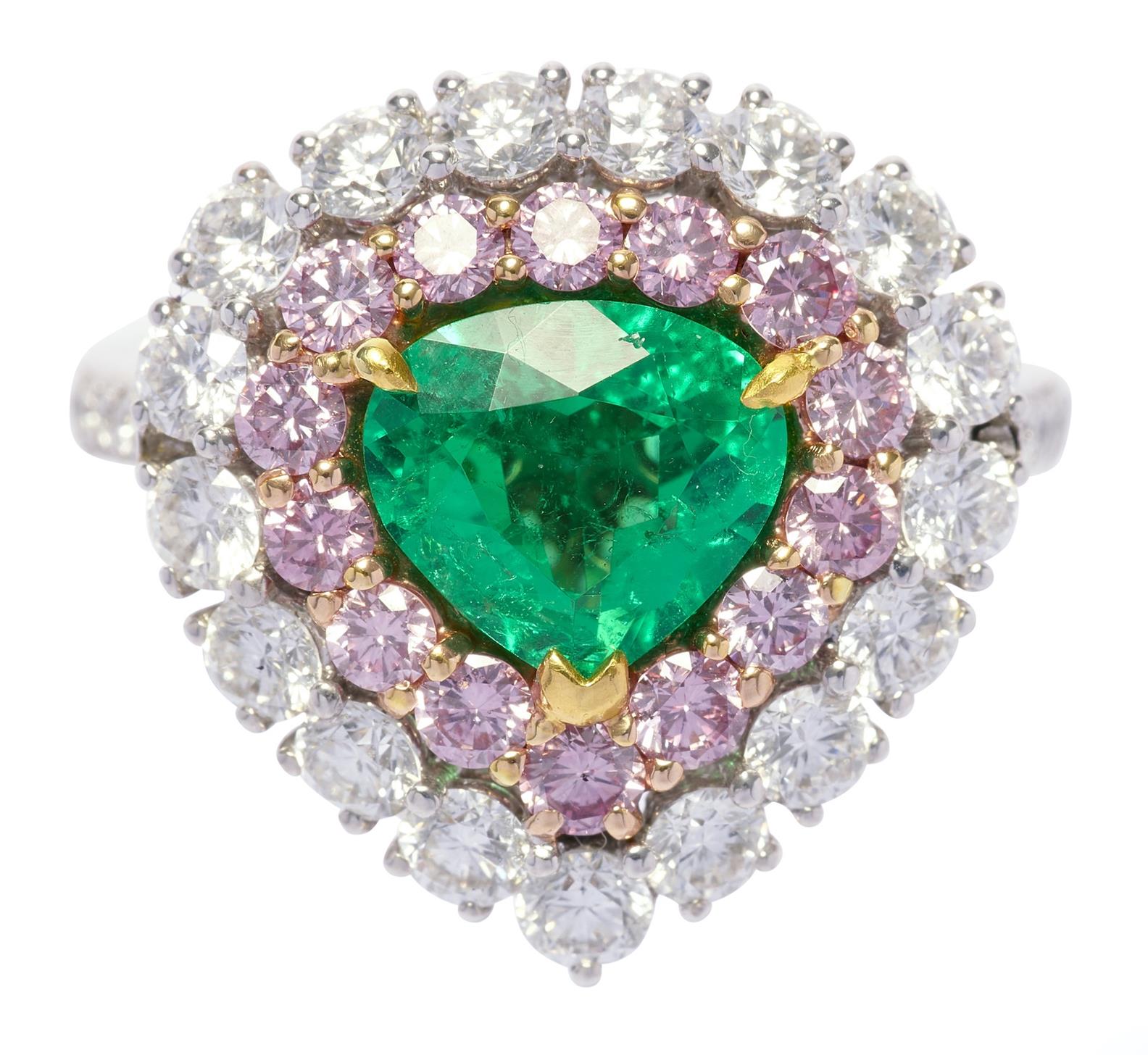 Of cluster design, centring a claw-set pear-shape emerald weighing 1.56 carats, framed by a line of 14 fancy intense pink brilliant-cut diamonds together weighing approximately 1.74 carats, further surrounded by a line of 17 diamonds between shoulders pavé-set with diamonds, the undercarriage similarly decorated with diamonds, size L.