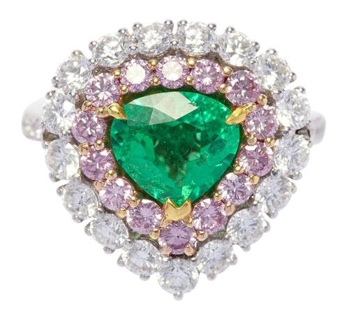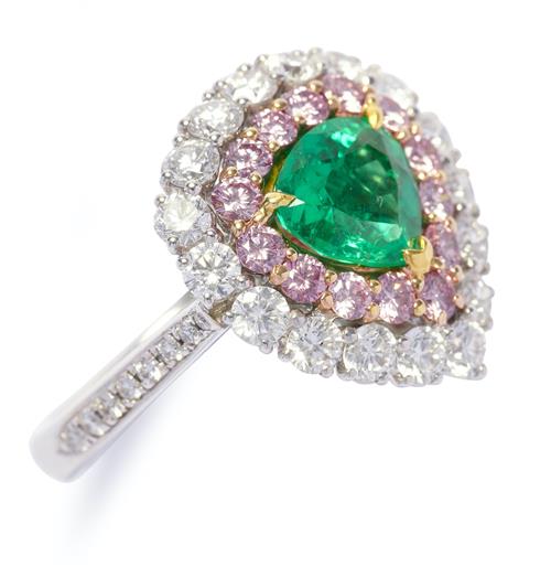PLATINUM, EMERALD AND ARGYLE PINK DIAMOND AND DIAMOND RING