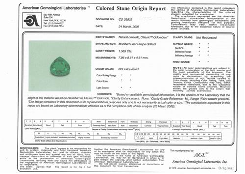 Accompanied by an AGL report number CS 39529, dated 24 March 2008, stating that the 1.565 carat emerald is natural, with no indications of clarity enhancement, and is of Colombian origin.