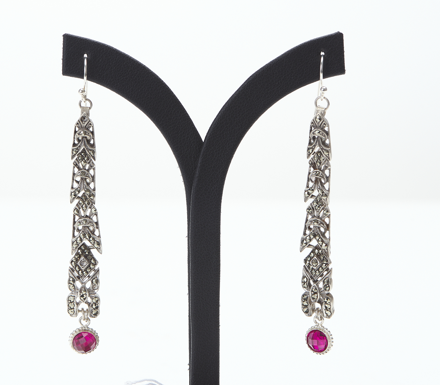 A PAIR OF VINTAGE PASTE AND MARCASITE EARRINGS IN SILVER, TO HOOK FITTINGS, LENGTH 73MM