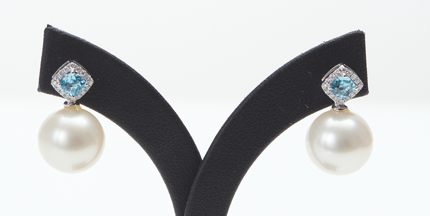 A PAIR OF SOUTH SEA PEARL, DIAMOND AND TOPAZ EARRINGS IN 18CT WHITE GOLD, THE ROUND PEARLS MEASURING 12.4MM, TO POST AND BUTTERFLY FITTINGS