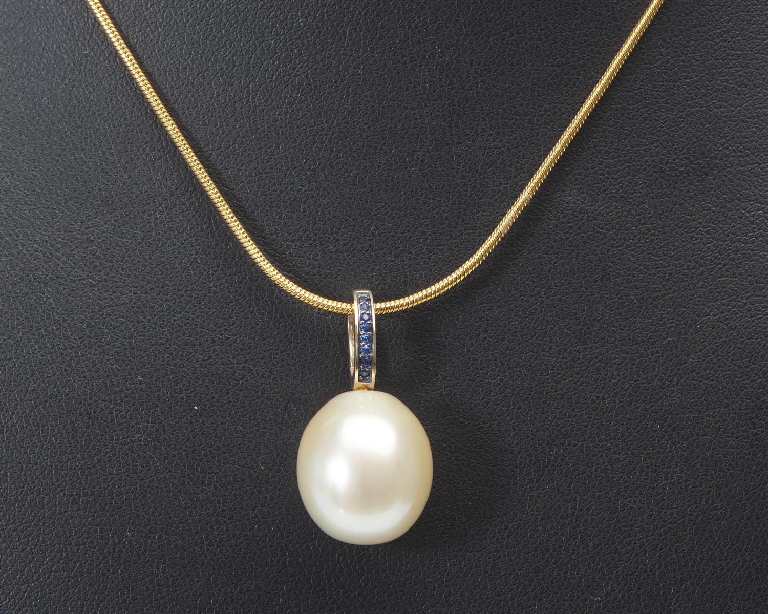 A SOUTH SEA PEARL AND SAPPHIRE PENDANT IN 9CT GOLD, THE OVAL SHAPED PEARL MEASURING 14MM, TOTAL LENGTH 27MM