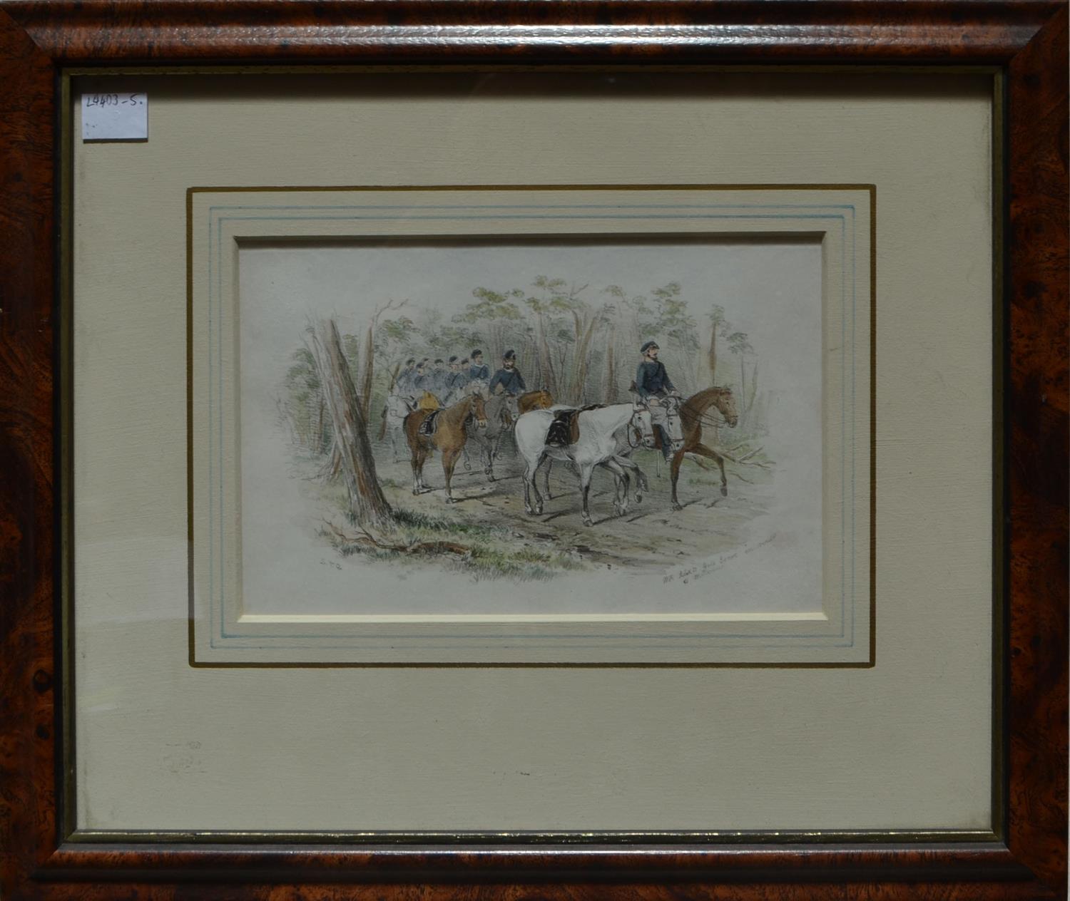 S. T GILL, MOUNTED POLICE GOLD ESCORT EN ROUTE TO MELBOURNE, HAND COLOURED LITHOGRAPH, 13 X 20CM, FRAME SIZE: 32 X 37.5CM, CONDITION: VERY GOOD, LEONARD JOEL DELIVERY SIZE: SMALL