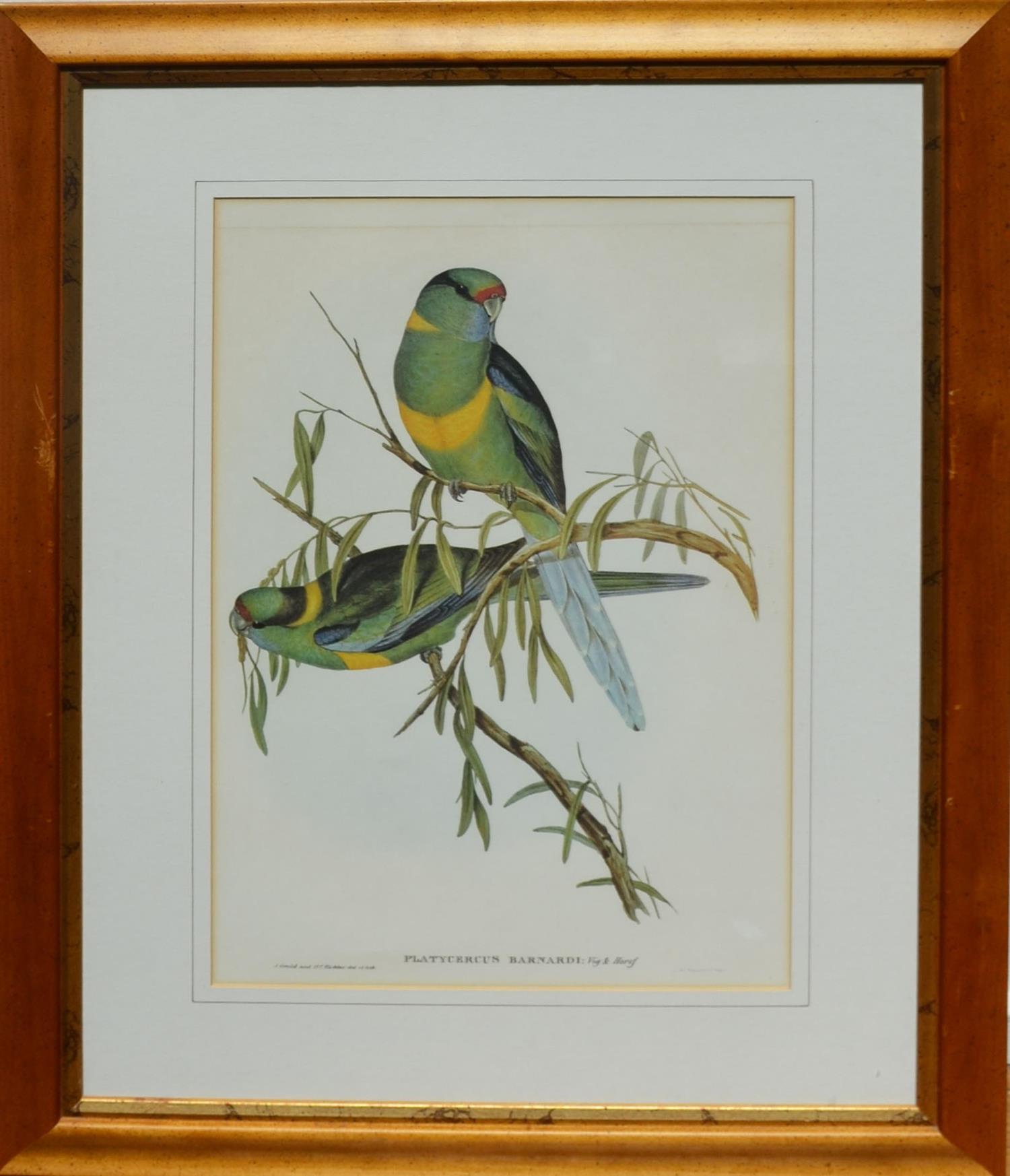 JOHN GOULD, PLATYCERCUS BARNARDI, REPRODUCTION PRINT, 52 X 34CM, FRAME SIZE: 78.5 X 60.5CM, CONDITION: FAIR, WITH SOME DISCOLOURATION TO THE FAR EDGES OF THE IMAGE, AND A HORIZONATAL LINE APPROX 2CM FROM THE MOUNT, LEONARD JOEL DELIVERY SIZE: MEDIUM