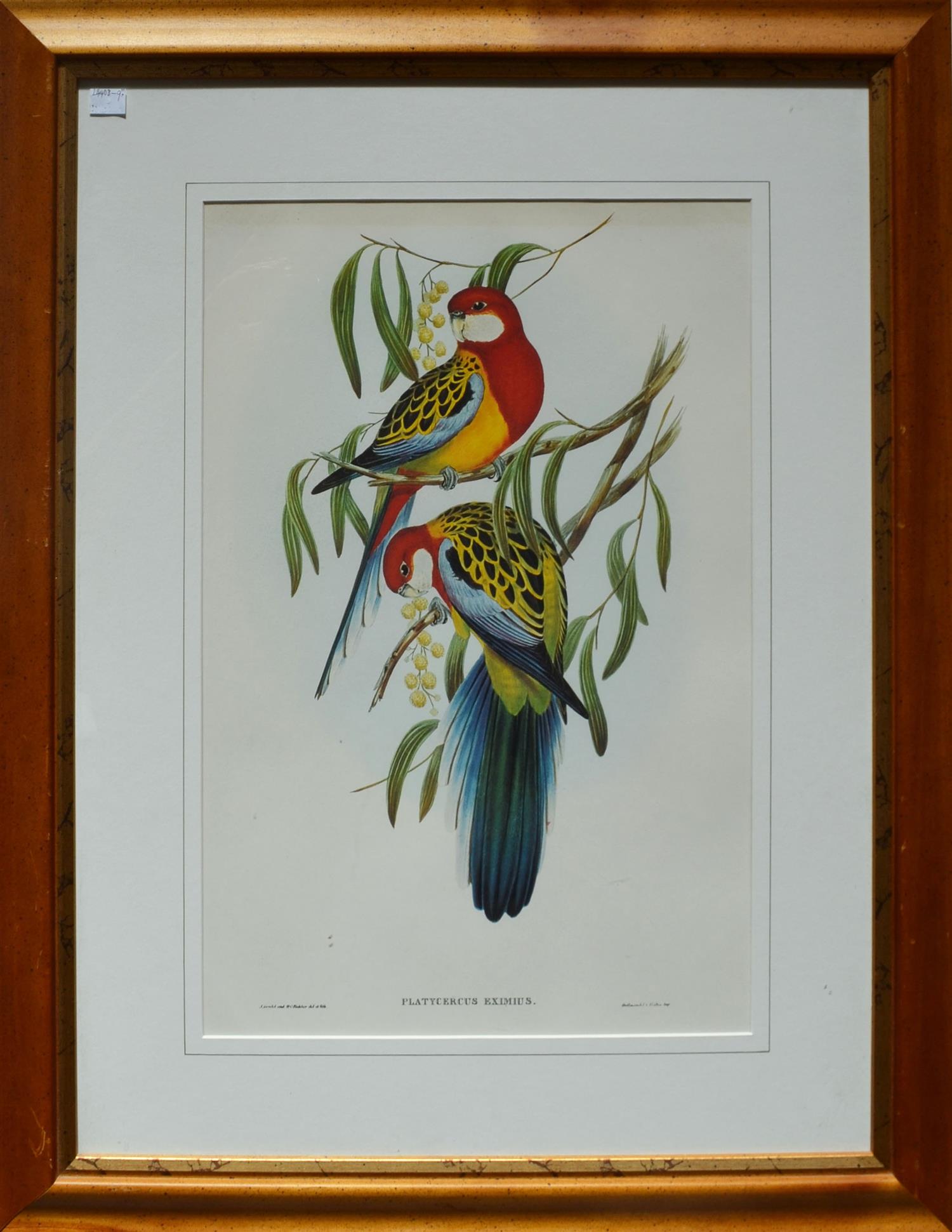 JOHN GOULD, PLATYCERCUS EXIMIUS, REPRODUCTION PRINT, 52 X 34CM, FRAME SIZE: 78.5 X 60.5CM, CONDITION: FAIR CONDITION, BROWN DISCOLOURATION RUNNING HORIZONTALLY, 2CM FROM MOUNT, LEONARD JOEL DELIVERY SIZE: MEDIUM