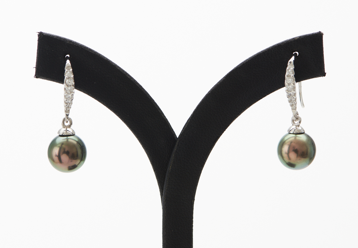 A PAIR OF TAHITIAN PEARL AND CUBIC ZIRCONIA EARRINGS IN STERLING SILVER, TO SHEPHERD HOOK FITTINGS, LENGTH 27MM