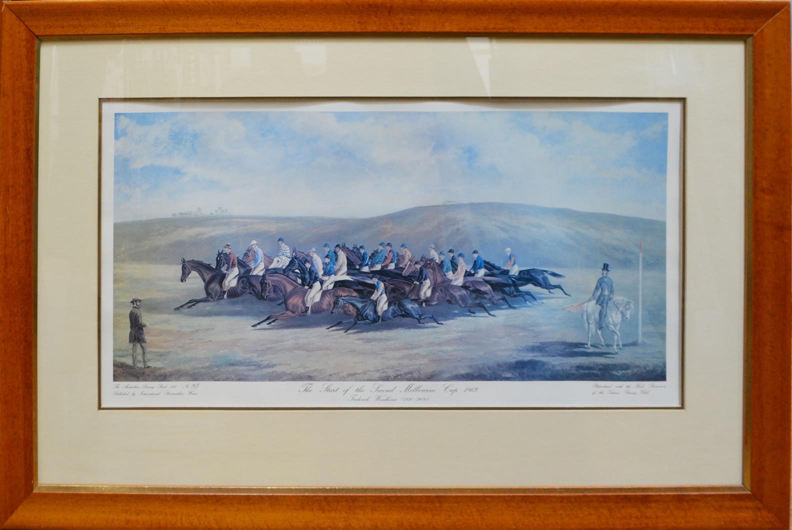 A PRINT OF THE START OF THE SECOND MELBOURNE CUP FROM 1862 BY FREDERICK WOODHOUSE, ED. 137, 35 X 73.5CM, FRAME SIZE: 70 X 104.5CM, CONDITION: MINOR COCKLING AND FADING, LEONARD JOEL DELIVERY SIZE: LARGE