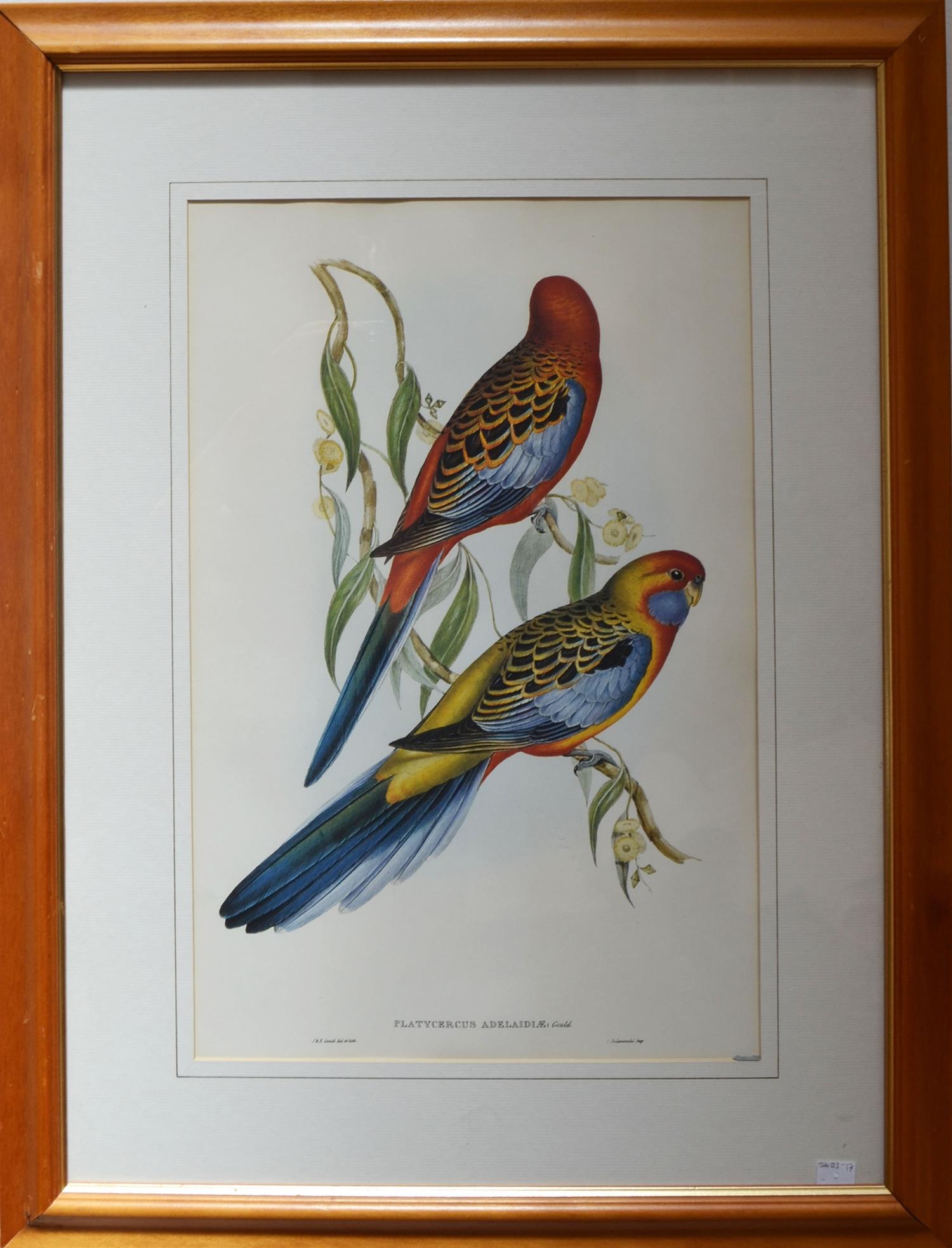 JOHN GOULD, PLATYCERCUS ADELAIDIAE, REPRODUCTION PRINT, 52 X 34CM, FRAME SIZE: 78.5 X 60.5CM, CONDITION: GOOD CONDITION, BROWN DISCOLOURATION, PIECE OF METAL CAUGHT BETWEEN GLASS AND THE MOUNT, LEONARD JOEL DELIVERY SIZE: MEDIUM