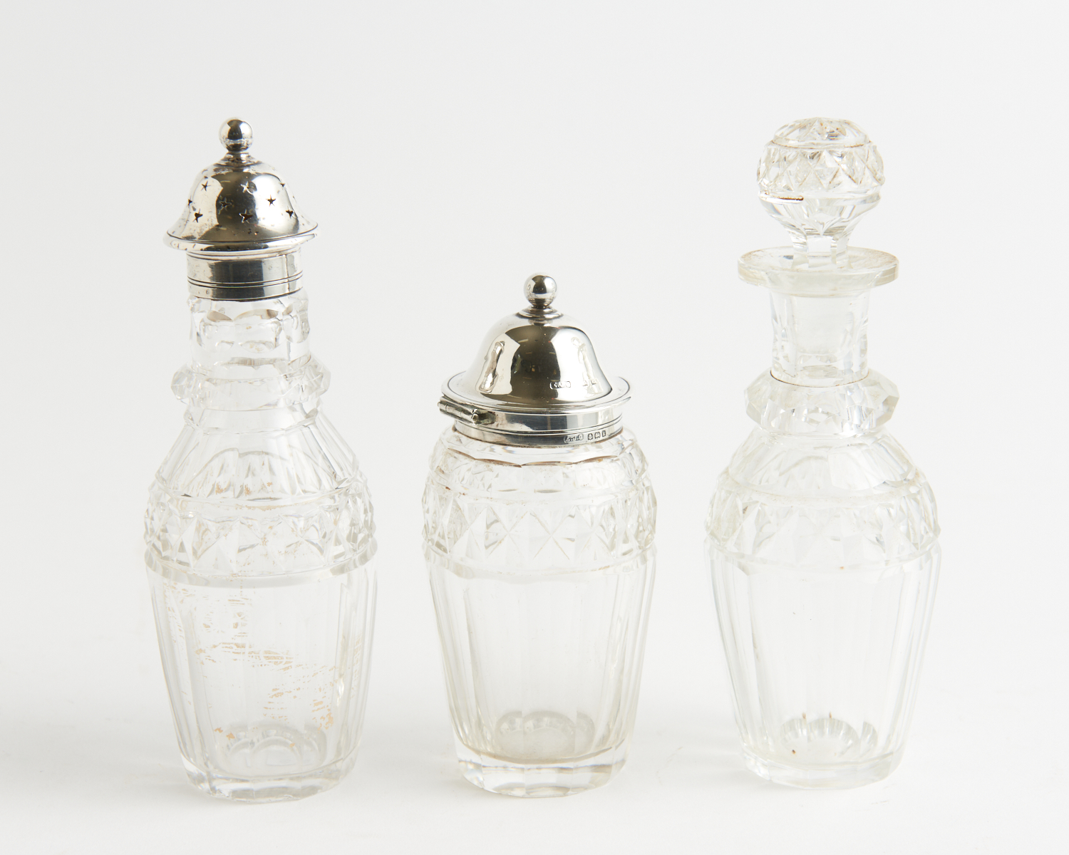 THREE VICTORIAN CONDIMENT BOTTLES INCLUDING A STERLING SILVER MOUNTED MUSTARD POT AND A SILVER TOPPED CASTOR, TALLEST H.17CM, LEONARD JOEL LOCAL DELIVERY SIZE: SMALL