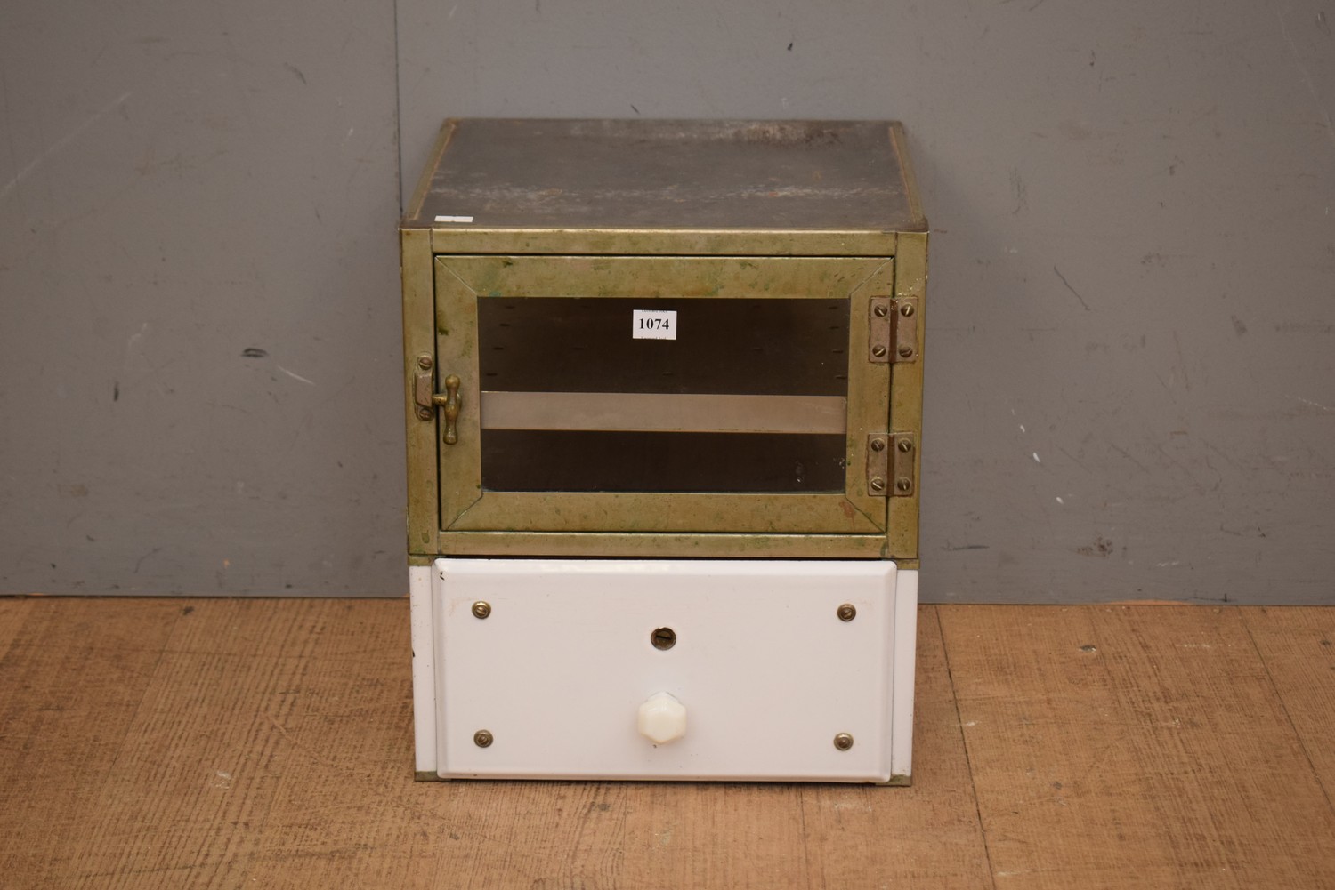 A VINTAGE 1920S AMERICAN ENAMEL AND NICKLE BOUND BARBERS STERILISING CABINET WITH DRAWER AND ADJUSTABLE SHELF (H36 X W30 X D30 CM) (LEONARD JOEL DELIVERY SIZE: SMALL)