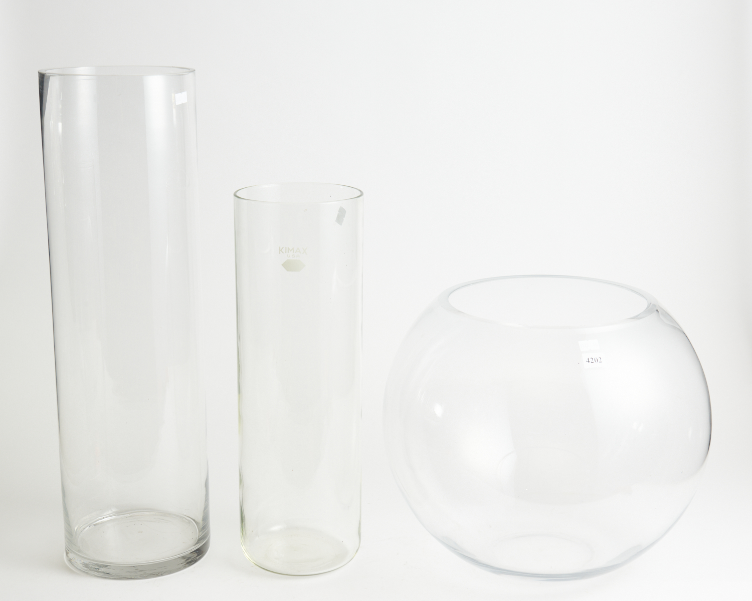 A GROUP OF THREE LARGE GLASS VESSELS, TALLEST H.60CM, LEONARD JOEL LOCAL DELIVERY SIZE: SMALL