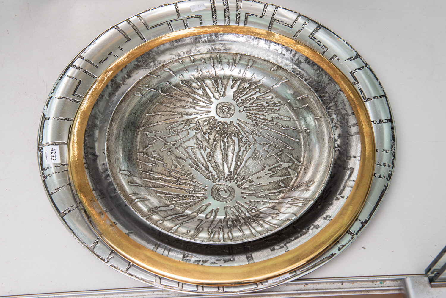 TWO 1970S DON SHEIL ALUMINIUM TRAYS AND A GLASS CHARGER WITH GILT EDGE, LARGEST DIA.47CM, LEONARD JOEL LOCAL DELIVERY SIZE: SMALL