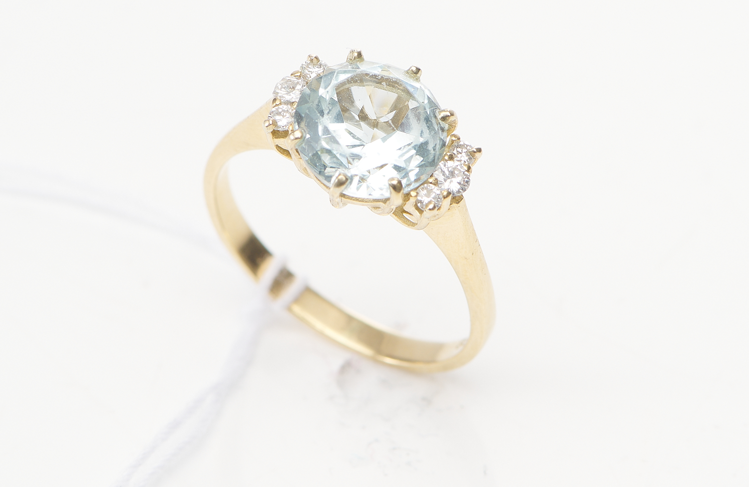 AN AQUAMARINE AND DIAMOND DRESS RING IN 18CT GOLD, SIZE O, 3.4GMS