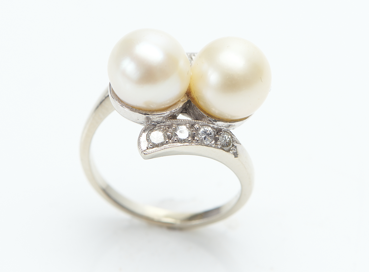 A CULTURED PEARL AND DIAMOND DRESS RING IN 14CT WHITE GOLD, SIZE J, 6.5GMS