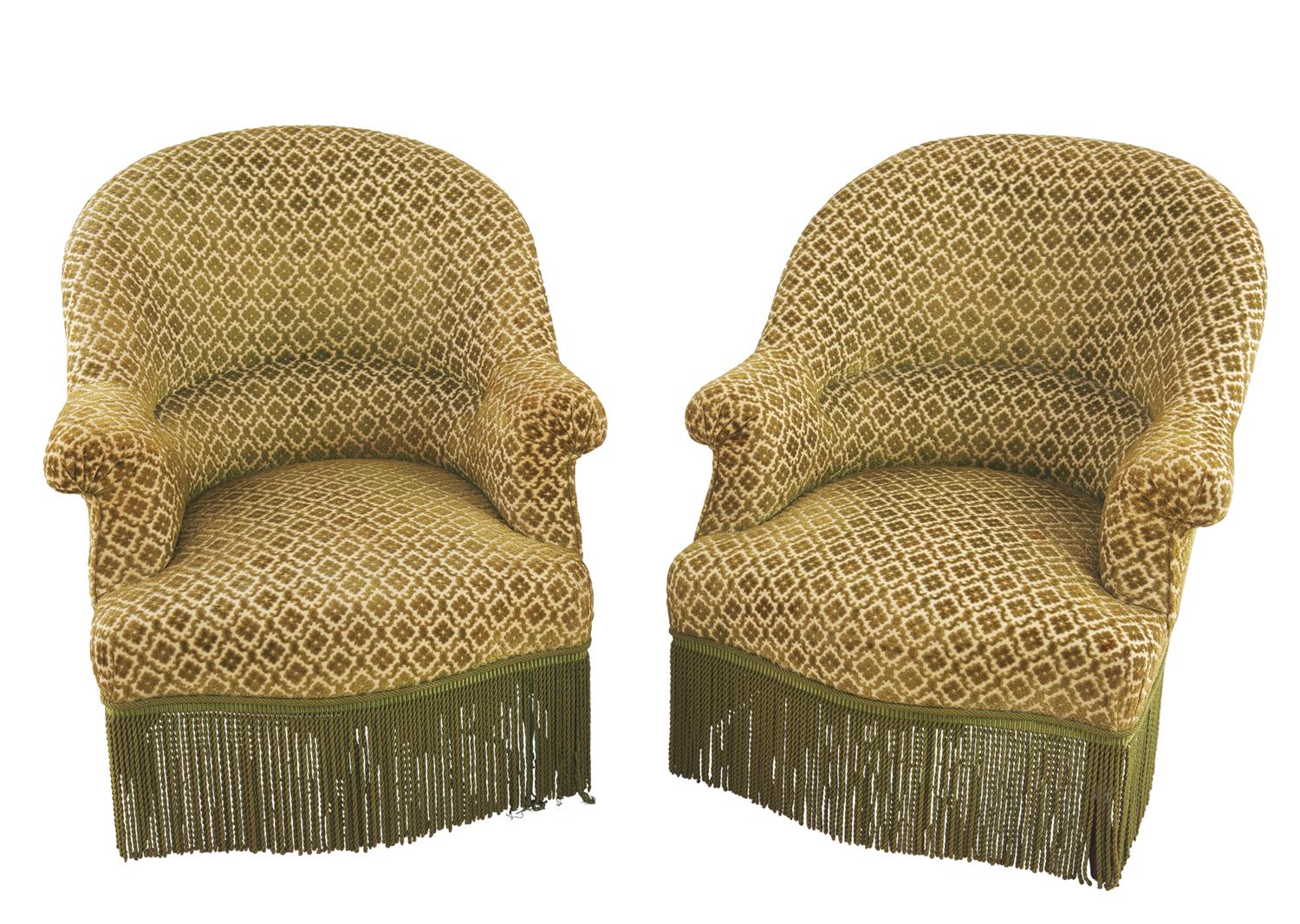 The stylish chairs with a rounded back raised on four feet, and covered in patterend olive green velvet with tassels.
