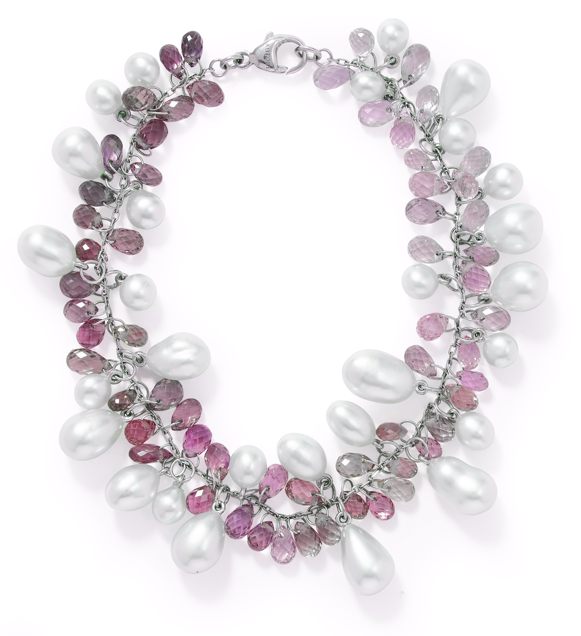 The cable link bracelet suspending a line of baroque cultured pearls measuring 6.00mm-7.00mm alternating between briolette pink sapphires together weighing 44.30 carats, length approximately 190mm, signed Autore.