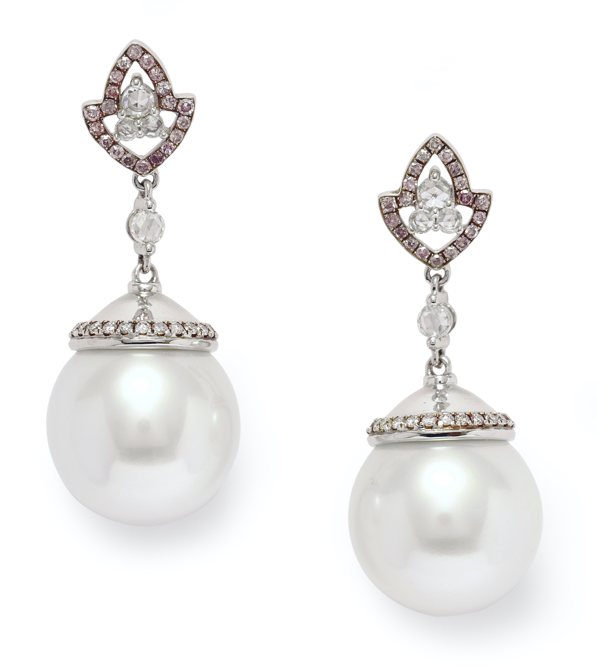 PAIR OF 18CT WHITE GOLD, SOUTH SEA PEARL, FANCY PINK DIAMOND AND DIAMOND EARRINGS, AUTORE
