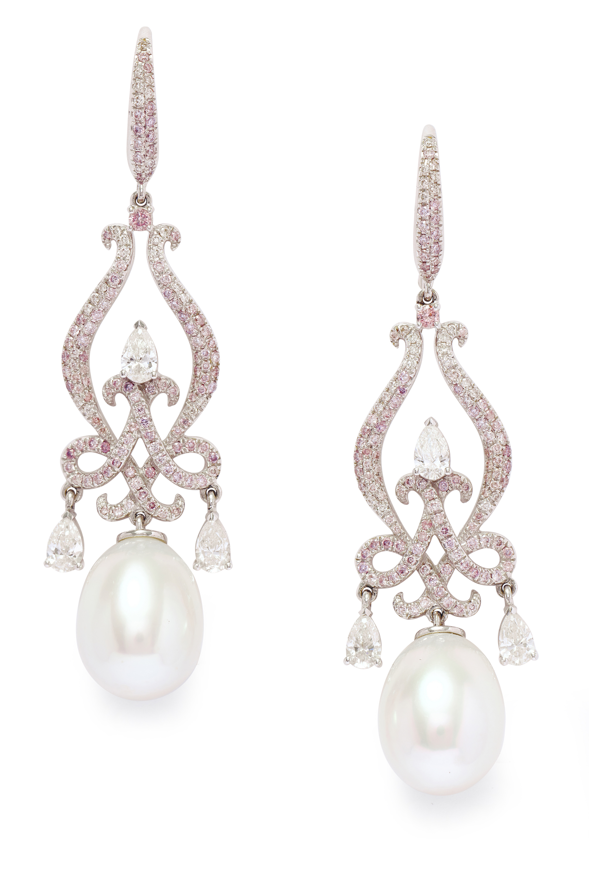PAIR OF 18CT WHITE GOLD, SOUTH SEA PEARL, FANCY PINK DIAMOND AND DIAMOND PENDANT EARRINGS, AUTORE