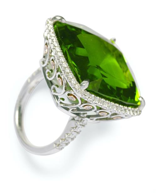 18CT WHITE GOLD, PERIDOT, ARGYLE FANCY PINK DIAMOND AND DIAMOND RING