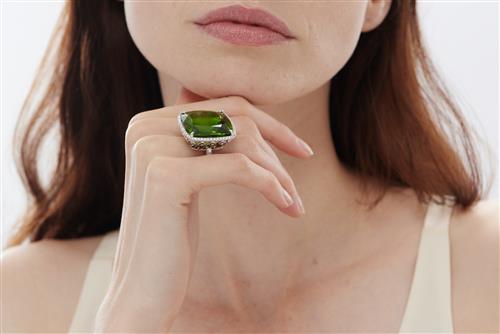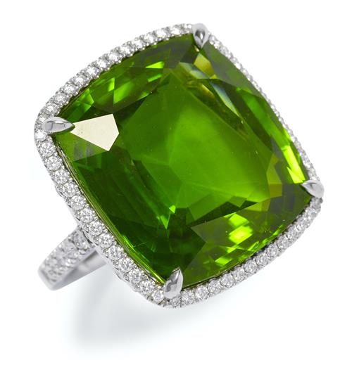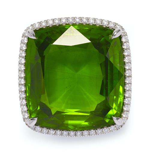 Of cluster design, centring a claw-set cushion-shaped vivid green peridot weighing 47.90 carats, framed with a line of near colourless brilliant-cut diamonds, the gallery and reverse decorated in an openwork scroll pattern pavé-set with near colourless and Argyle natural fancy pink diamonds, the near colourless diamonds and pink diamonds together weighing approximately 0.13 carat and 0.81 carat respectively, size L.