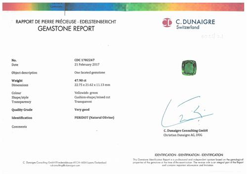 Accompanied by a C. Dunaigre report numbered CDC 1702247, dated 21 February 2017, stating that the 47.90 carat peridot is natural and of yellowish-green colour.