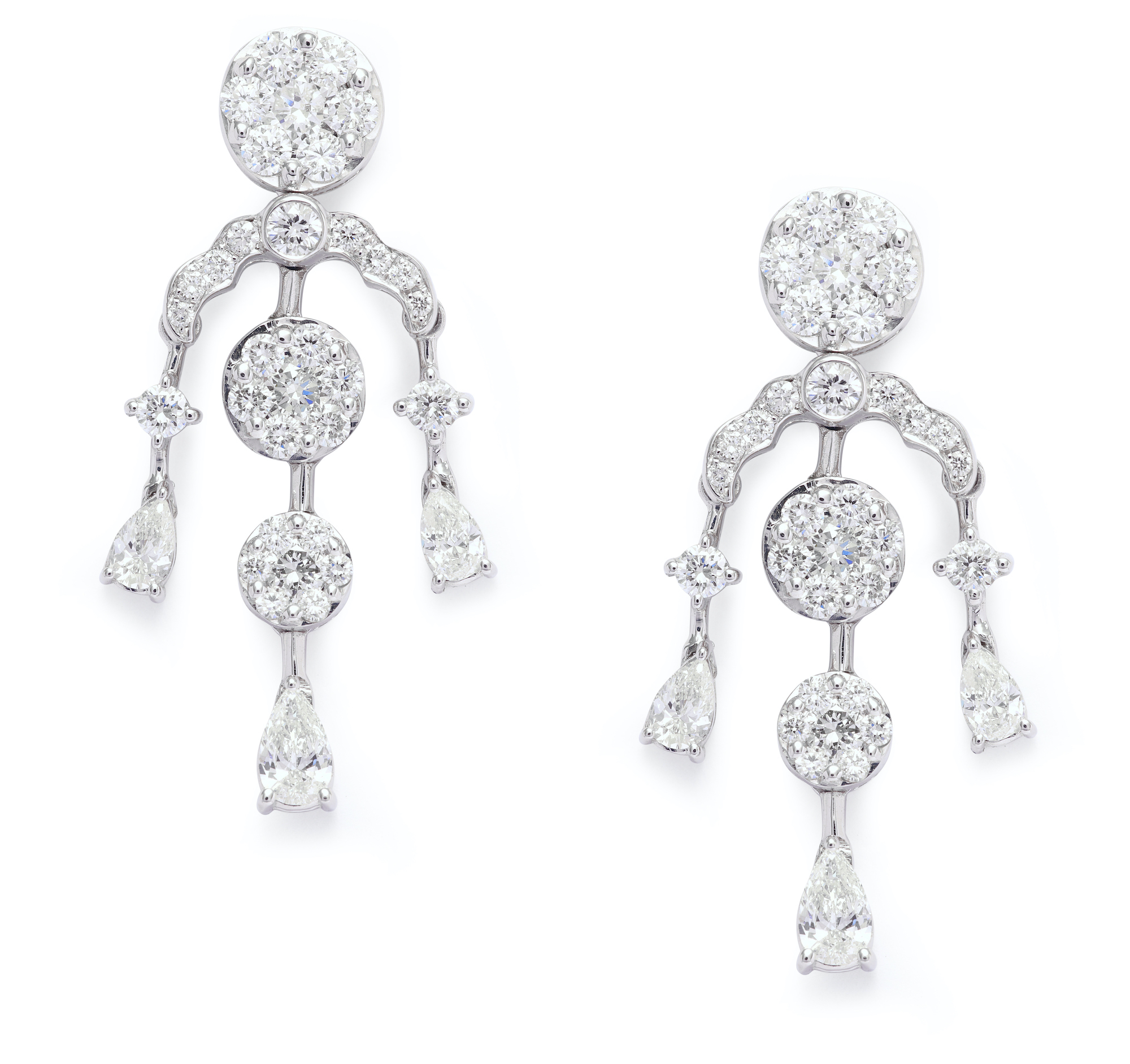 Of chandelier design, each surmount modelled as a cluster of brilliant-cut diamonds supporting a line of similarly set motifs between a pavé-set diamond connector terminating in three pear-shaped diamond swing drops, the diamonds together weighing approximately 1.93 carats, length approximately 28mm, post and scroll fittings.