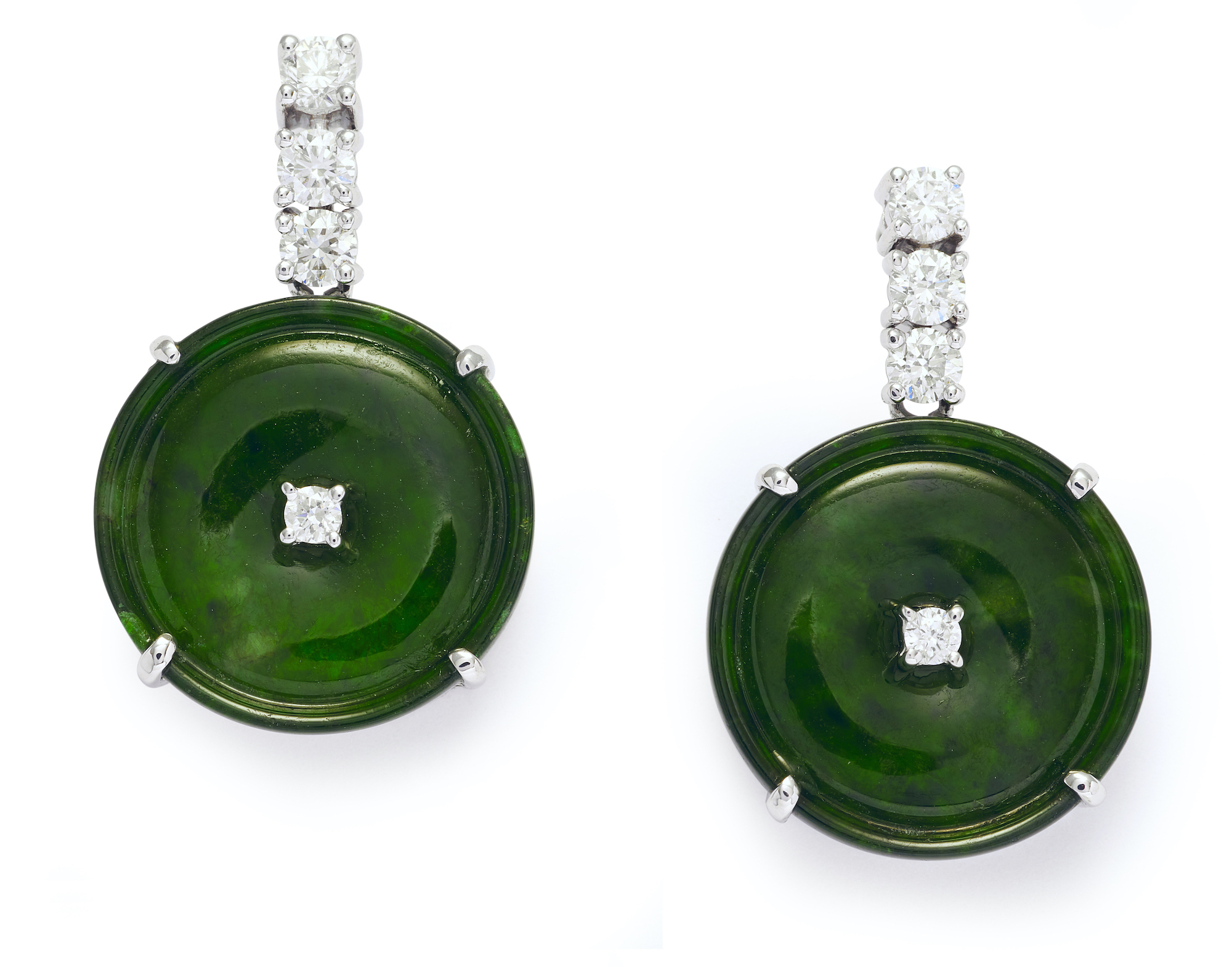 Each surmount decorated with a line of three brilliant-cut diamonds supporting a claw-set carved jade plaque modelled as a button accented with a diamond, the diamonds together weighing approximately 0.52 carat, length approximately 24mm, post fittings.