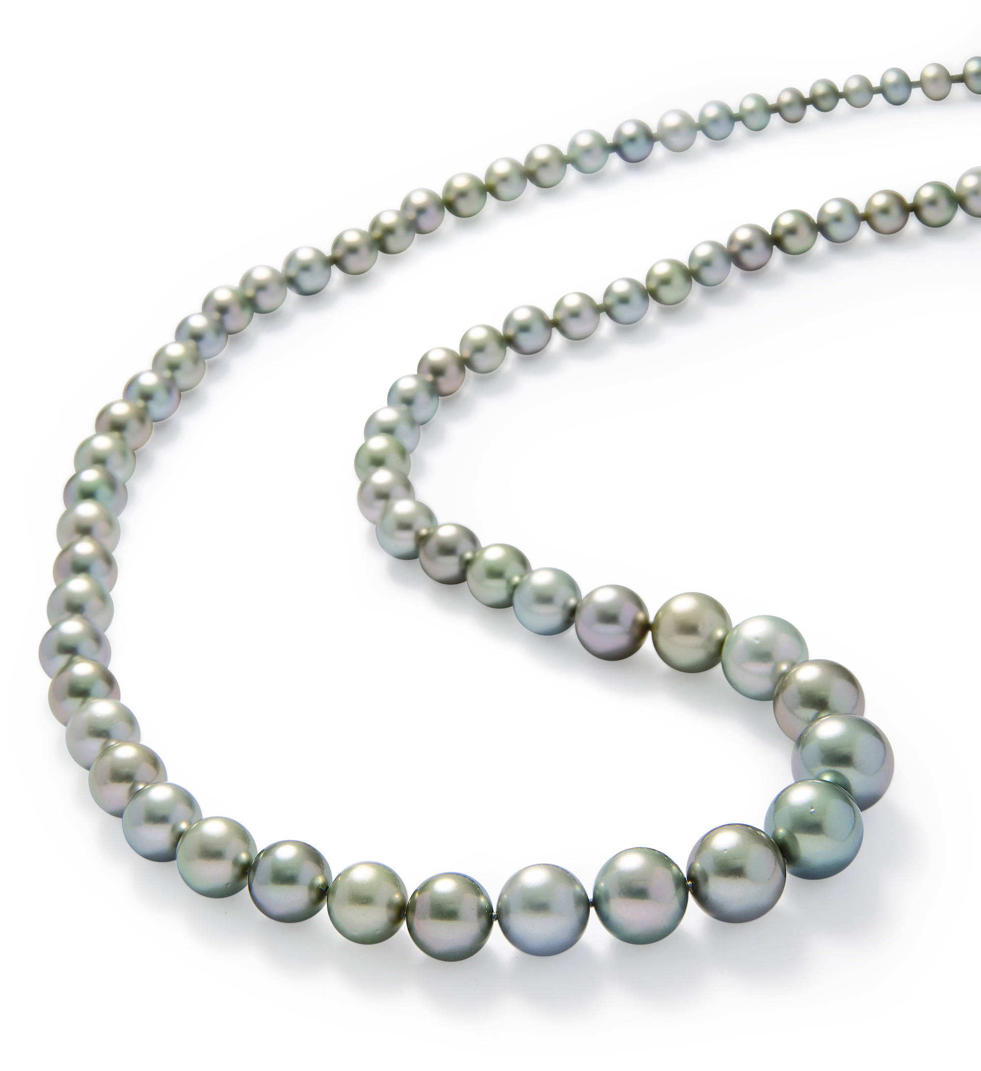 Composed of 202 cultured pearls of fine grey hue graduating from approximately 7.85mm-14.43mm, completed by an 18ct white gold ball clasp pavé-set at intervals with brilliant-cut diamonds together weighing approximately 0.30 carat, circumference approximately 2220mm.
