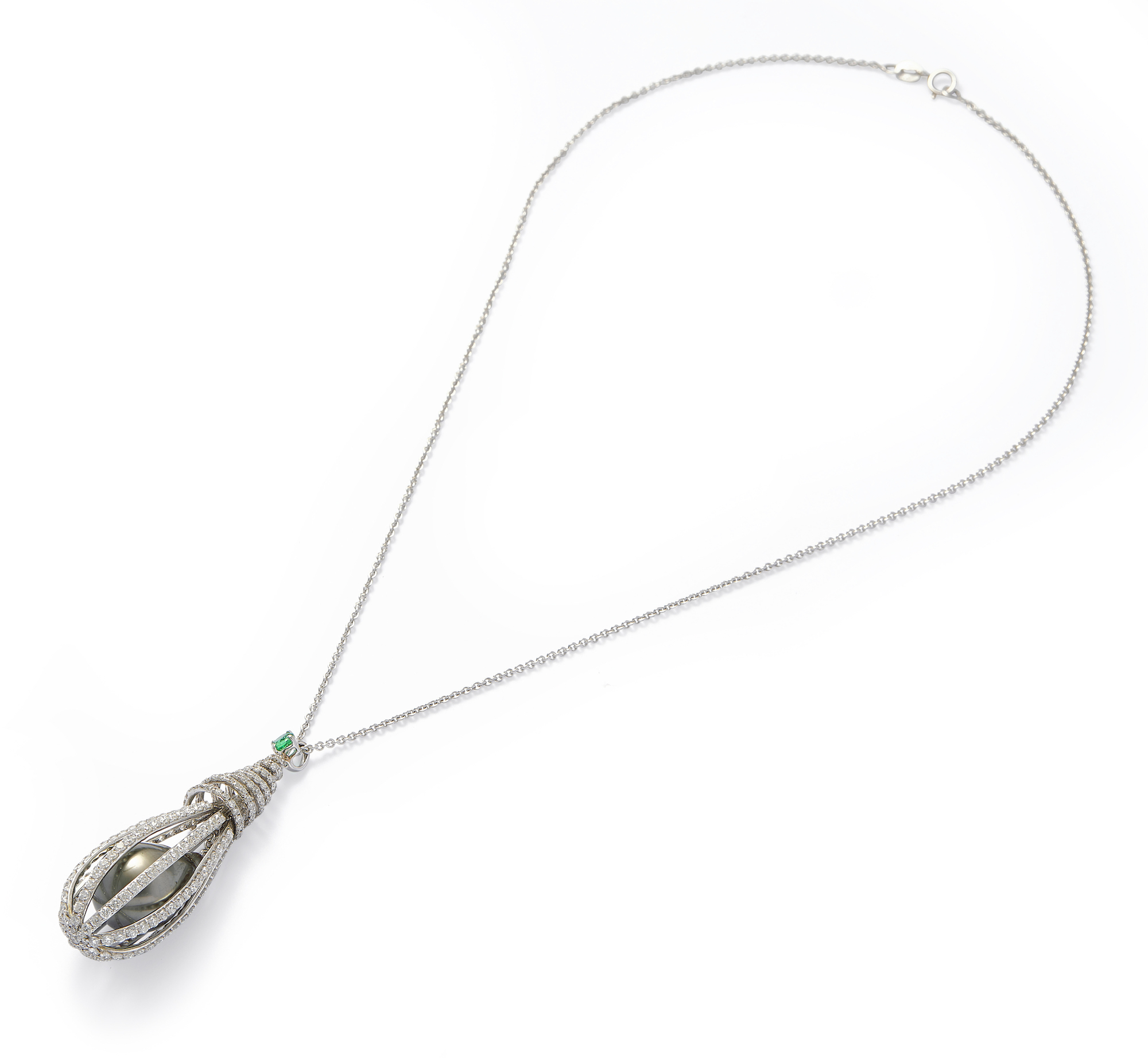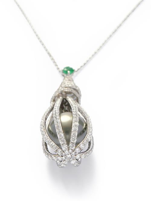 Terminating on an openwork drop-shaped swing drop surmounted by a coiled wire surmount, pavé-set with brilliant-cut diamonds enclosing a cultured pearl of grey tint, supported from a trace link chain between a circular-cut emerald connector, the diamonds together weighing approximately 4.60 carats, pendant approximately 55mm, length approximately 400mm.