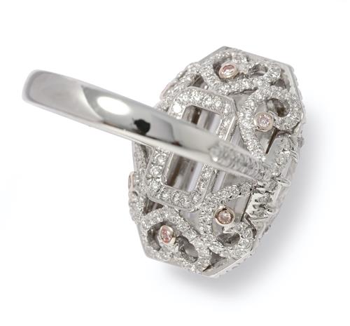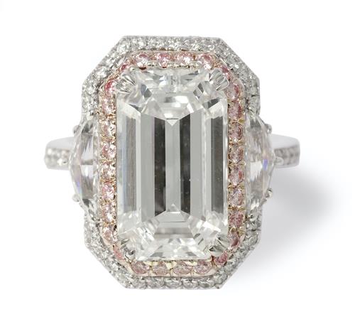 Of cluster design, centring a claw-set emerald-cut diamond weighing 7.09 carats framed by a line of Argyle natural fancy purplish pink brilliant-cut diamonds, further framed by a line of pavé-set near colourless diamonds, flanked by two near colourless trilliant diamonds together weighing approximately 1.12 carats, the underrail decorated with pavé-set near colourless and Argyle natural fancy purplish pink diamonds, the near colourless and purplish pink diamonds together weighing approximately 0.88 carat and 0.43 carat respectively, size L1/2.