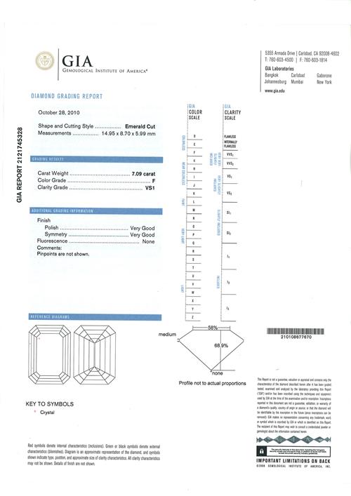 Accompanied by a GIA report number 2121745328, dated 28 October 2010, stating that the 7.09 carat diamond, is F colour, VS1 clarity.