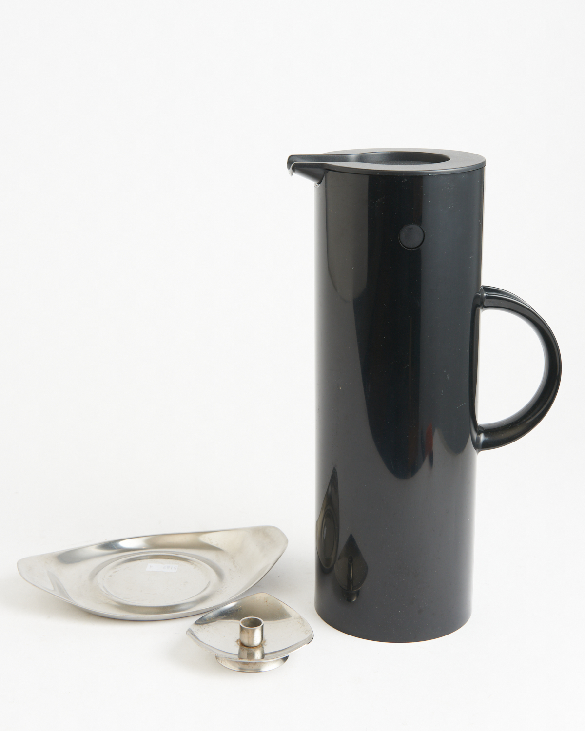 A BLACK STELTON VACUUM JUG BY ERIK MAGNUSSEN, A STELTON CANDLE HOLDER, AND A WMF SIDE DISH, LEONARD JOEL LOCAL DELIVERY SIZE: SMALL