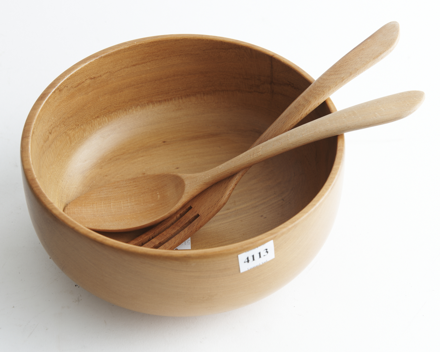 A PINE SALAD BOWL (23 CM DIAMETER) WITH SALAD SERVERS, LEONARD JOEL LOCAL DELIVERY SIZE: SMALL