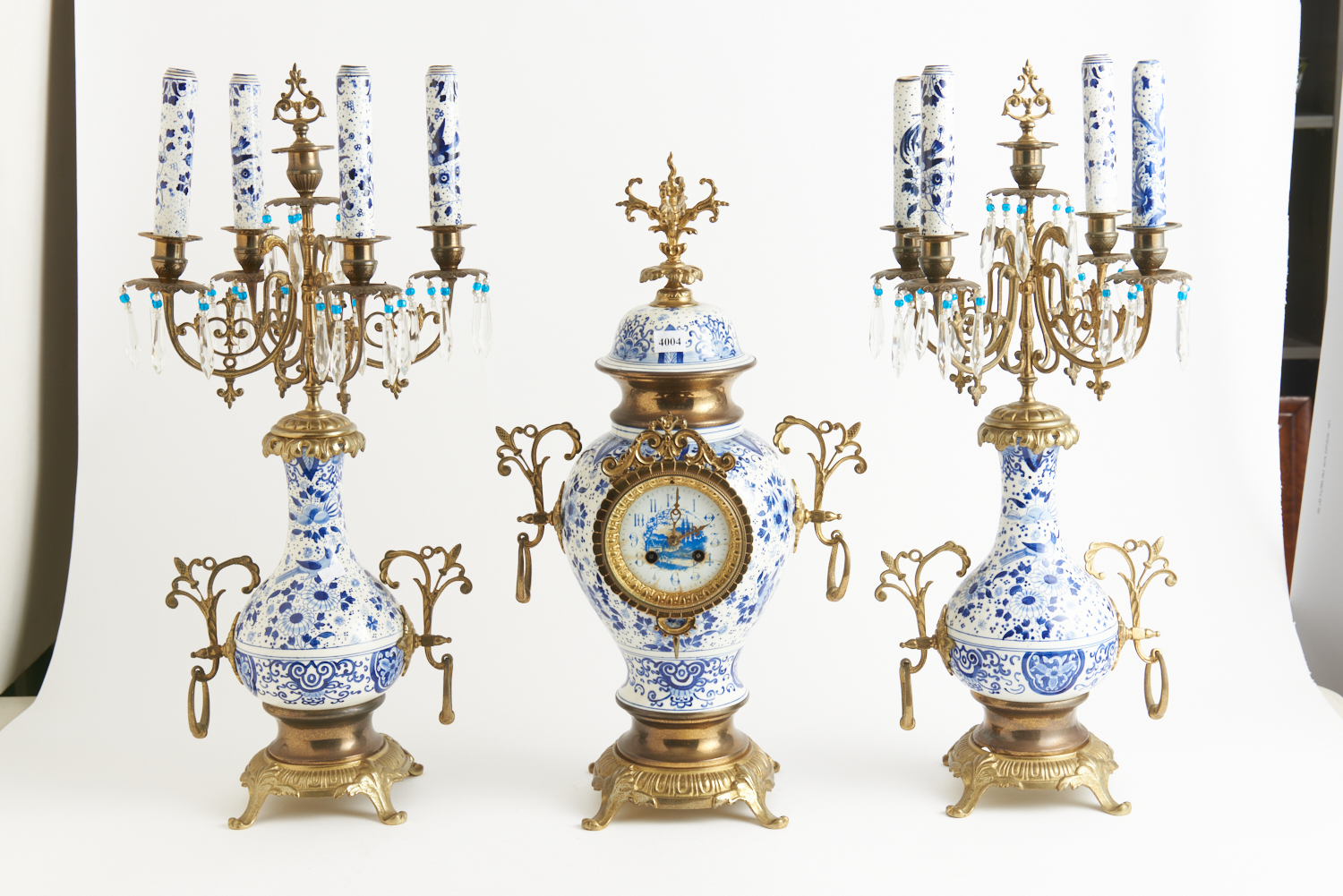 A FRENCH GILT METAL MOUNTED BLUE AND WHITE PORCELAIN THREE PIECE CLOCK GARNITURE, EACH GARNITURE WITH FOUR SCONCES, HUNG WITH GLASS LUSTRES, THE CLOCK 55 CM HIGH, EACH GARNITURE 62 CM HIGH, LEONARD JOEL LOCAL DELIVERY SIZE: MEDIUM