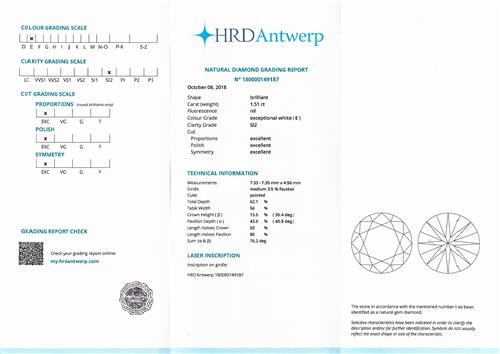 Accompanied by a HRD Antwerp report numbered 180000149187, dated 8 October 2018, stating the one diamond weighs 1.51 carat, E colour, SI2 clarity, laser inscribed;