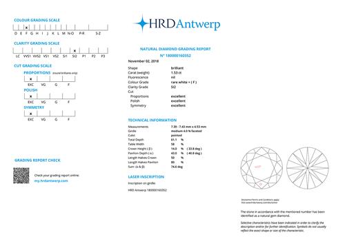 a report from the HRD Antwerp Grading Report Link site numbered 180000160352, dated 2 November 2018, stating the one diamond weighs 1.53 carat, F colour, SI2 clarity, laser inscribed.