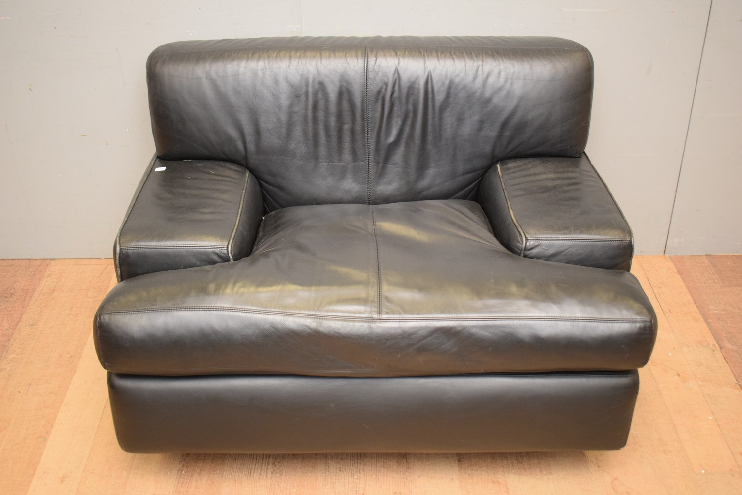 AN AUSTRALIAN CUSTOM MADE LEATHER ARMCHAIR BY BILL LUKE, C 2000 (A/F) (76H x 104W x 99D CM) (PLEASE NOTE THIS HEAVY ITEM MUST BE REMOVED BY CARRIERS AT THE CUSTOMER'S EXPENSE. LEONARD JOEL STAFF CANNOT ASSIST CARRYING THIS ITEM) (X-LARGE ITEM)