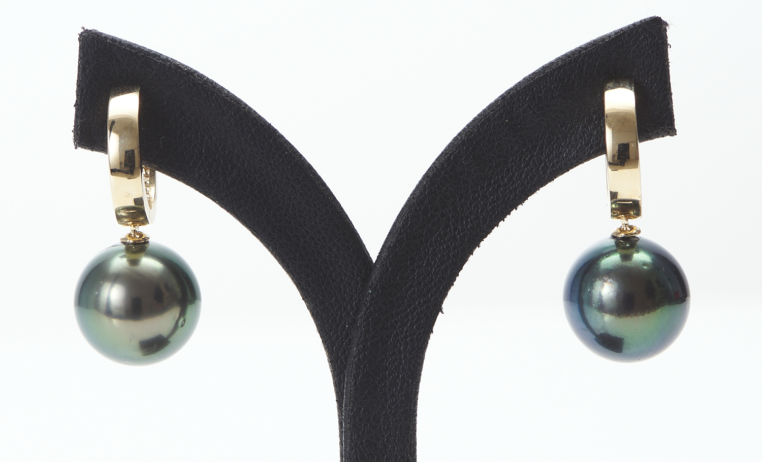 The pearls present peacock green hues, excellent lustre with minor natural blemishes to skin.
