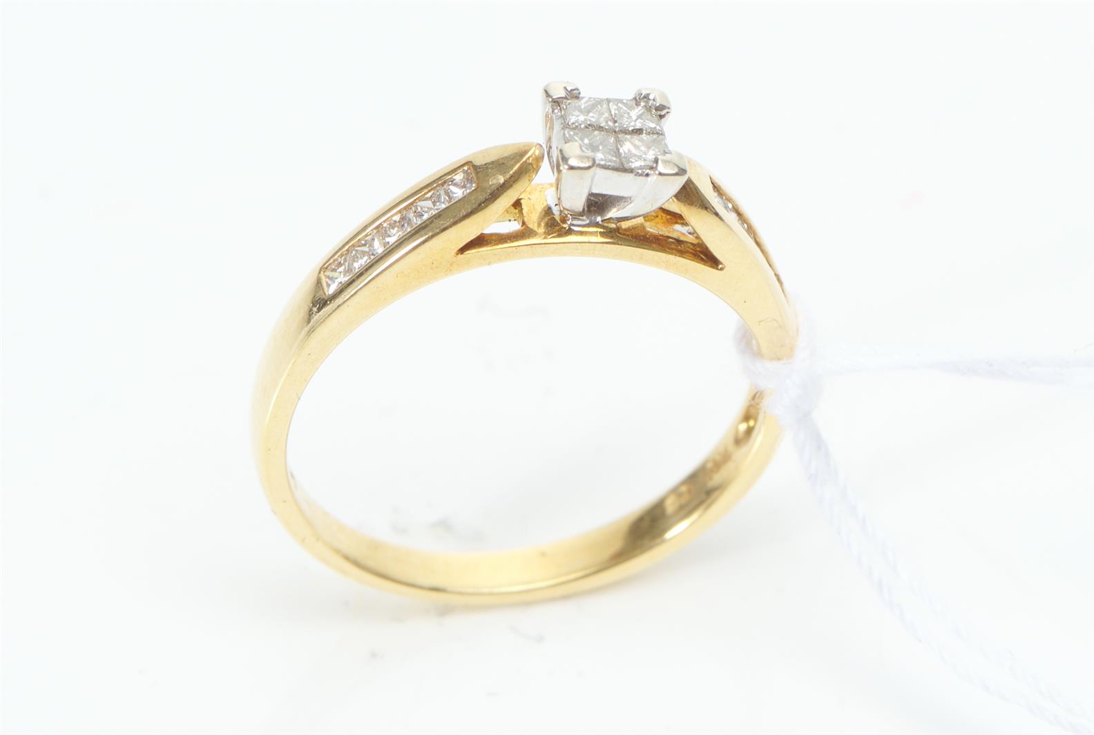 A DIAMOND DRESS RING IN 18CT GOLD, CENTRALLY SET WITH A PRINCESS CUT DIAMOND ESTIMATED 0.50CT, WITH FURTHER DIAMOND DETAIL, SIZE O, 3.2GMS