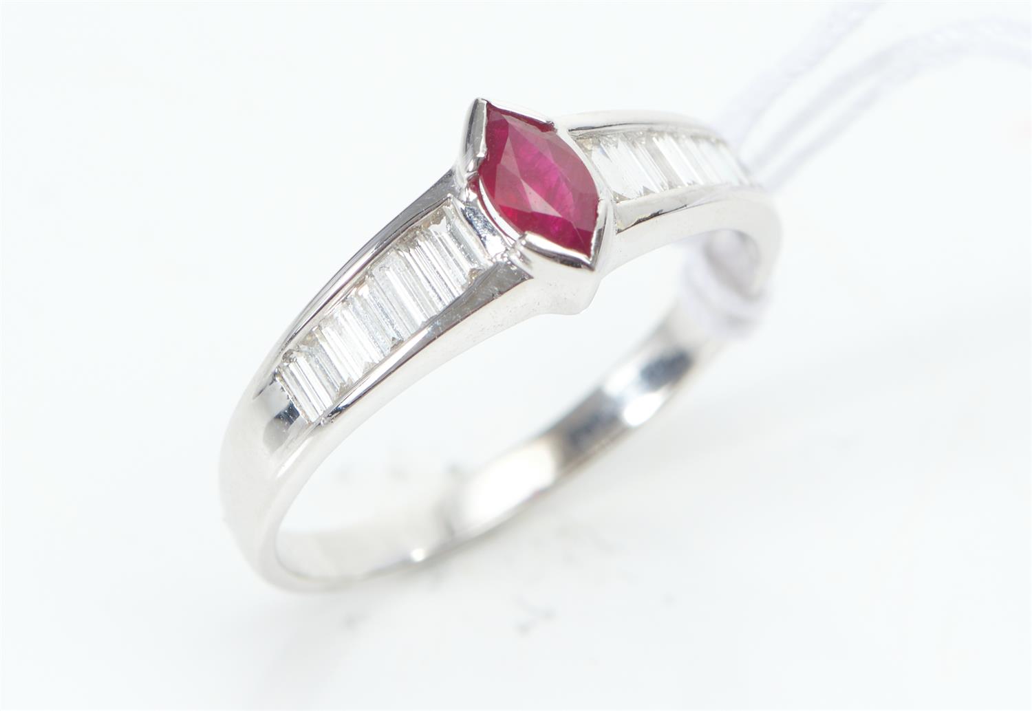 A RUBY AND DIAMOND DRESS RING IN 18CT WHITE GOLD, SIZE O, 2.4GMS