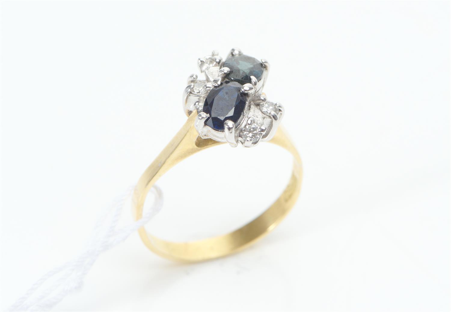 A SAPPHIRE AND DIAMOND DRESS RING IN TWO TONE 18CT GOLD, SIZE M-N, 3.5GMS