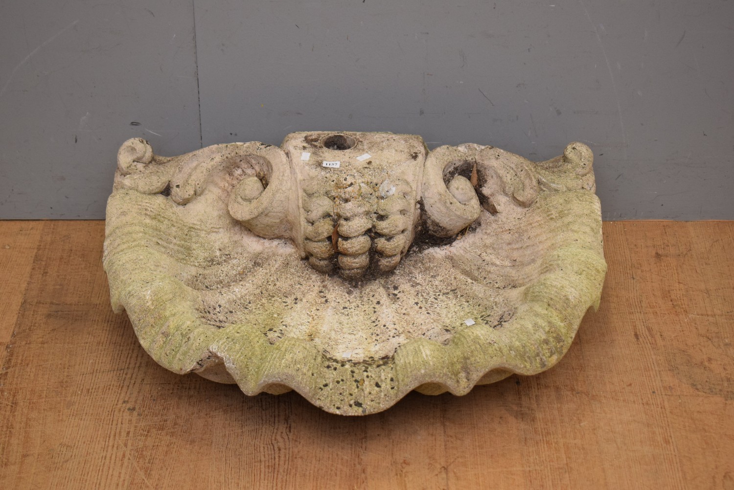 A LARGE ORNATE ANTIQUE CONCRETE CLAMSHELL GARDEN ORNAMENT (A/F) (20H x 77W x 57D CM) (PLEASE NOTE THIS HEAVY ITEM MUST BE REMOVED BY CARRIERS AT THE CUSTOMER'S EXPENSE. LEONARD JOEL STAFF CANNOT ASSIST CARRYING THIS ITEM) (X-LARGE ITEM)