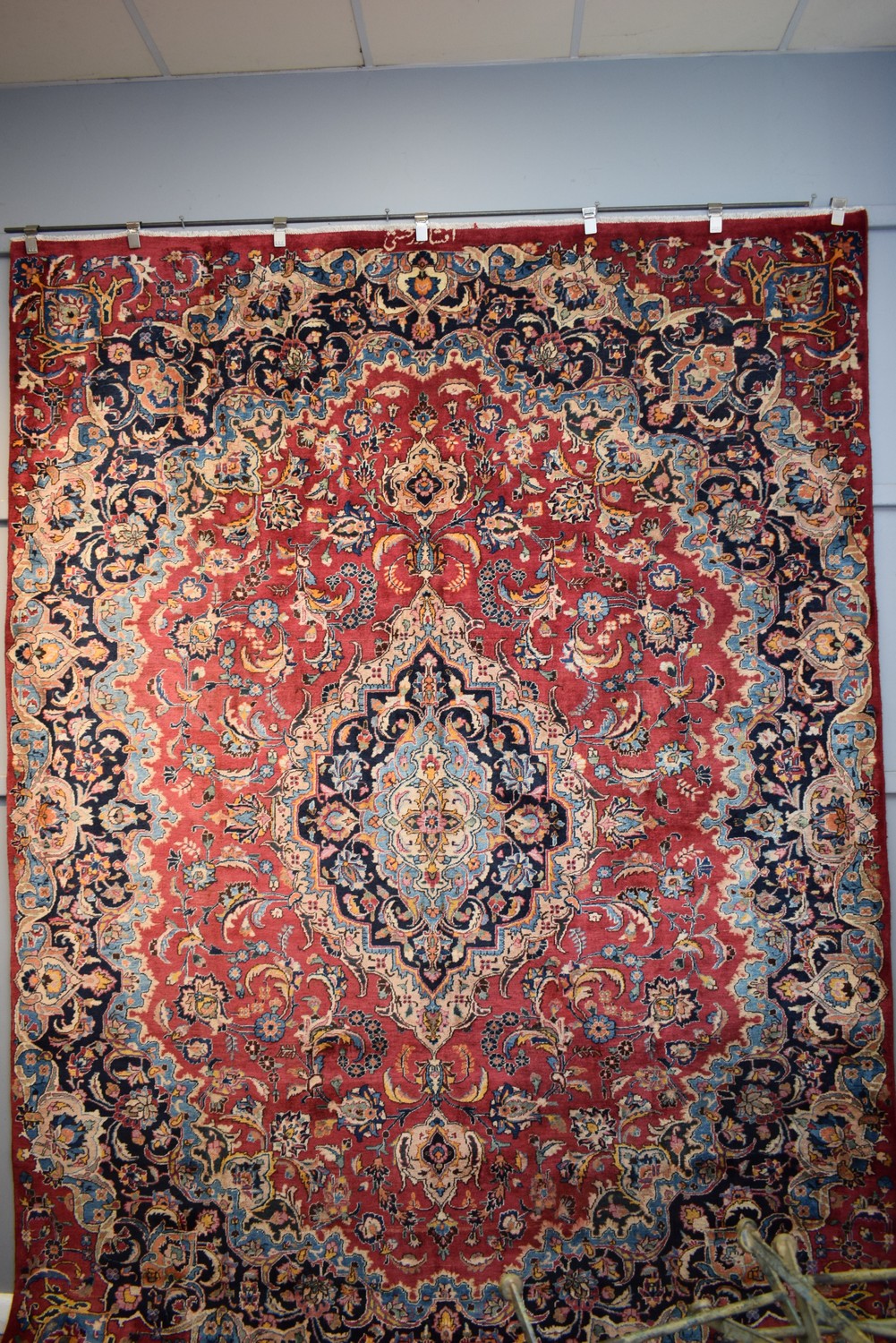 A CIRCA 1960s PERSIAN MASHHAD CARPET. 100% WOOL PILE. HAND-KNOTTED & SIGNED WORKSHOP WEAVE WITH RARE DESIGN OF BOLD ELONGATED MEDALLION & INNER FLORAL-PATTERNED BORDER IN A RED FIELD OF PALMETTES, FLORAL SPRAYS & SAZ LEAVES. EX-GALLERY INVENTORY. FULLY RESTORED CARPET. CERTIFICATE OF AUTHENTICITY INCLUDED. SIZE: 340X255CM ORIGIN: PERSIA - RRP: $6,500 (LEONARD JOEL DELIVERY SIZE: LARGE)