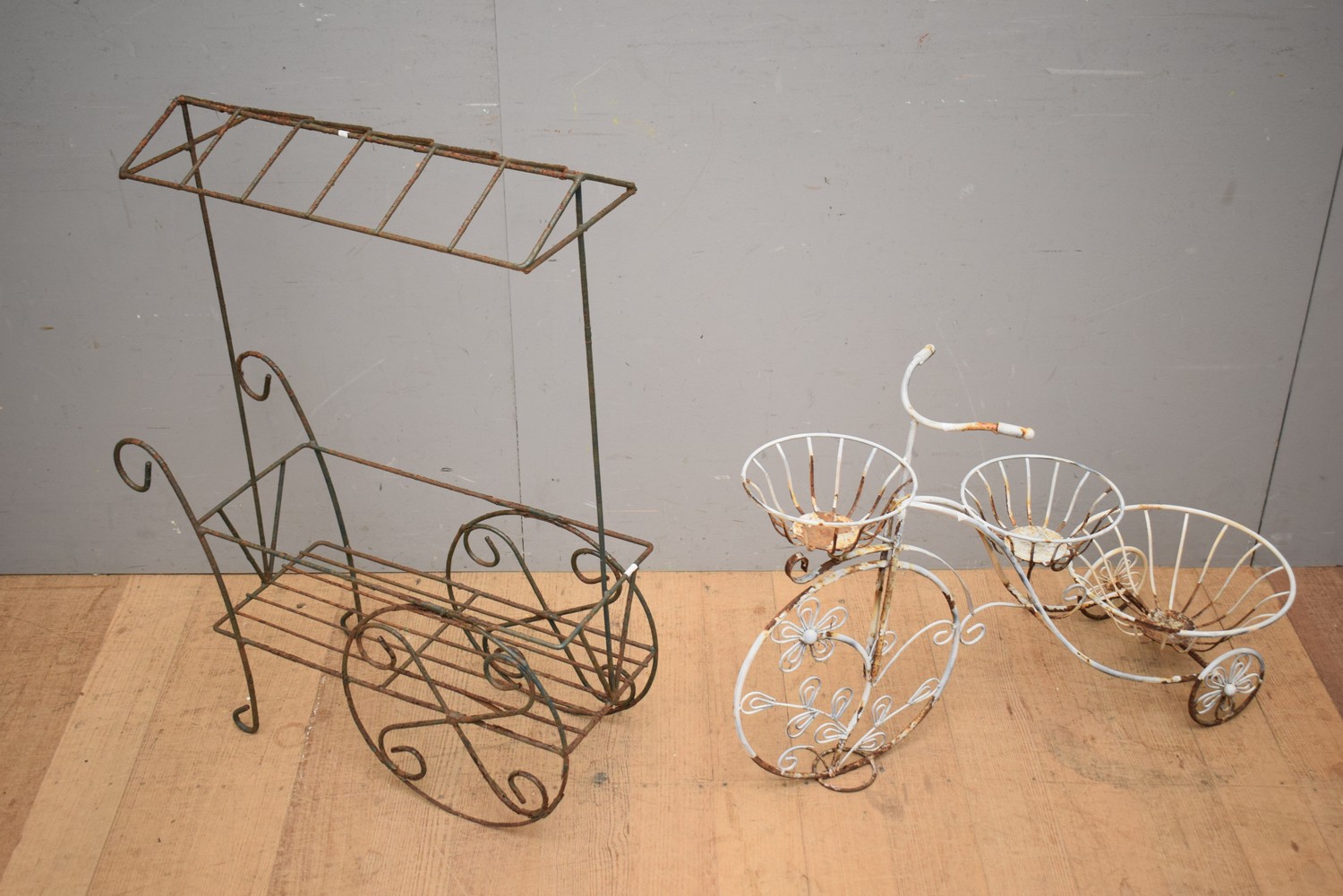 TWO IRON PLANTERS INCLUDING BICYCLE ON TROLLEY (LARGEST 84H x 66W x 23D CM) (LEONARD JOEL DELIVERY SIZE: SMALL)