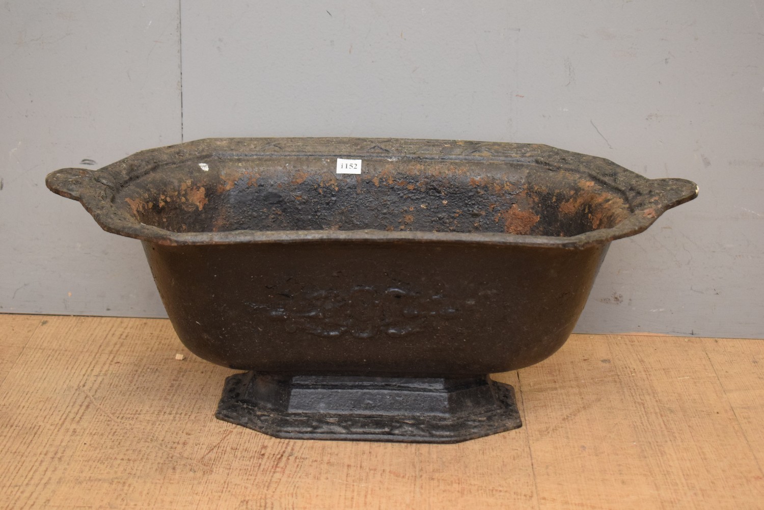 A 19TH CENTURY FRENCH CAST IRON PLANTER WITH RAISED DECORATION TO ONE SIDE (24H x 63W x 31D CM) (LEONARD JOEL DELIVERY SIZE: MEDIUM)